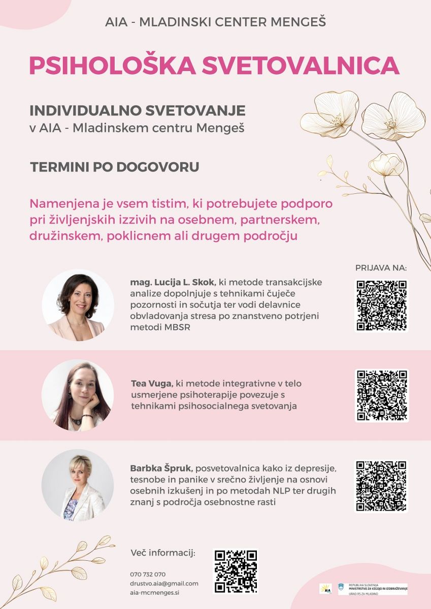 V okviru AIA - Mladinskega centra Mengeš poteka psihološka svetovalnica, ki jo vodijo: