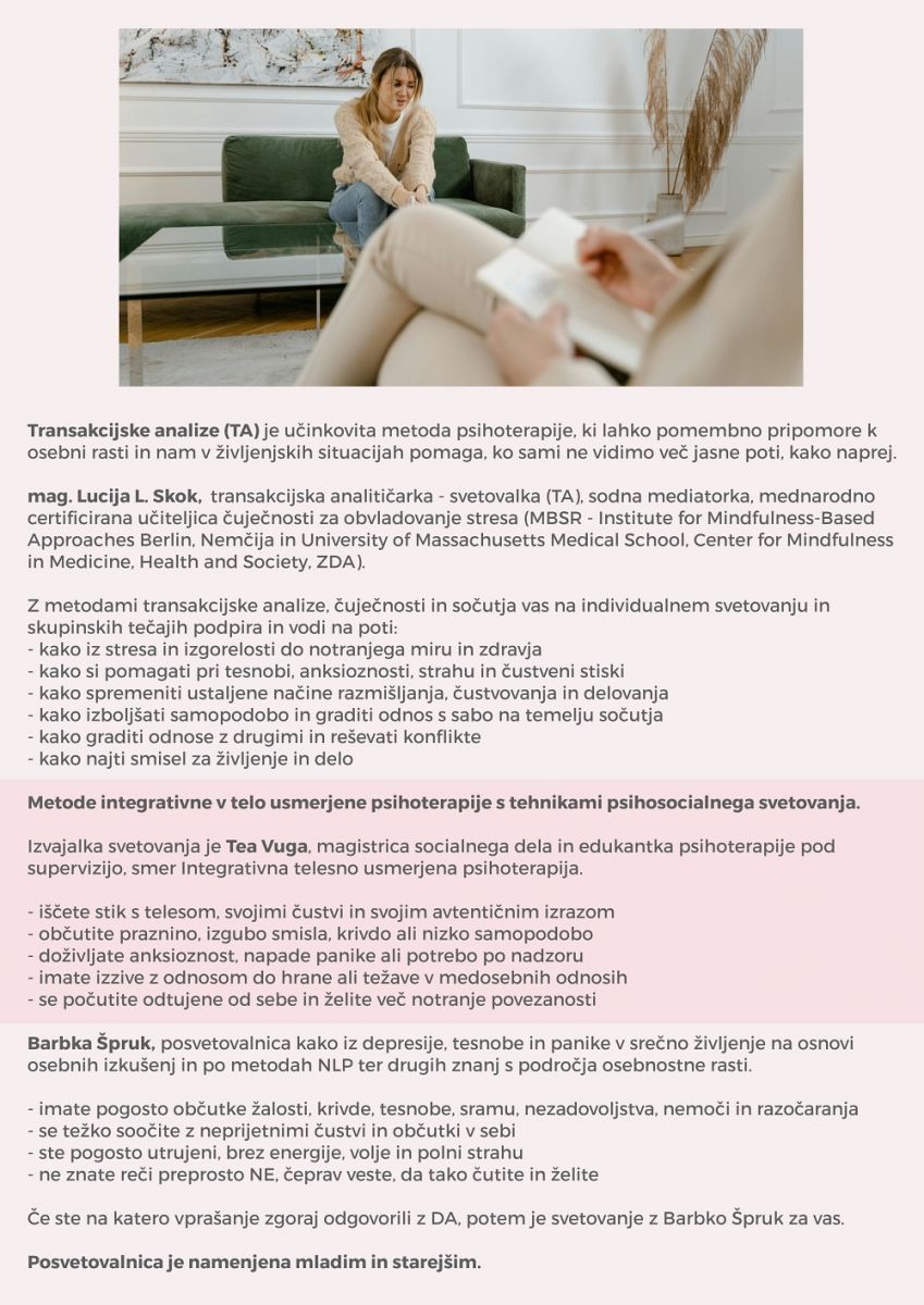 Namenjena je vsem tistim, ki potrebujete podporo pri življenjskih izzivih na osebnem, partnerskem, družinskem, poklicnem ali drugem področju.