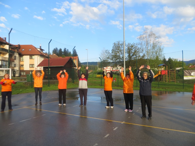 Ko sem v začetku povprašala nekaj žensk, če bi hodile na jutranjo vadbo, sem bila prav presenečena, ker ni nobena odklonila, tako sem si rekla: "pa začnimo!". Skoraj cel mesec smo se vozili v Črnomelj k naši Lidiji. Ko smo vaje osvojili, smo šli "na svoje" in 15. aprila bomo upihnili že prvo svečko. V skupini je najstarejša članica stara 83 let in najstarejši član 82. Oba sta zelo gibčna, kar se vidi tudi na sliki.