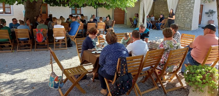 Nato smo se odpeljali na degustacijo do pršutarne Ščuka, ki je del družinskega posestva v vasi Kobjeglava na Krasu. Posedli smo se pod murvo, ki z mogočno krošnjo v obliki dežnika predstavlja simbol posestva. Ob prijetnem klepetu smo poskušali ponujene dobrote. Prijazni gostitelji so nam pripravili ogled pršutarne in nam preko videa prikazali postopek izdelovanja in sušenja pršuta. Neokrnjena narava in kraška klima omogočata zorenje na naraven način brez dimljenja mesnin. Po želji smo se v trgovini založili z njihovimi dobrotami.